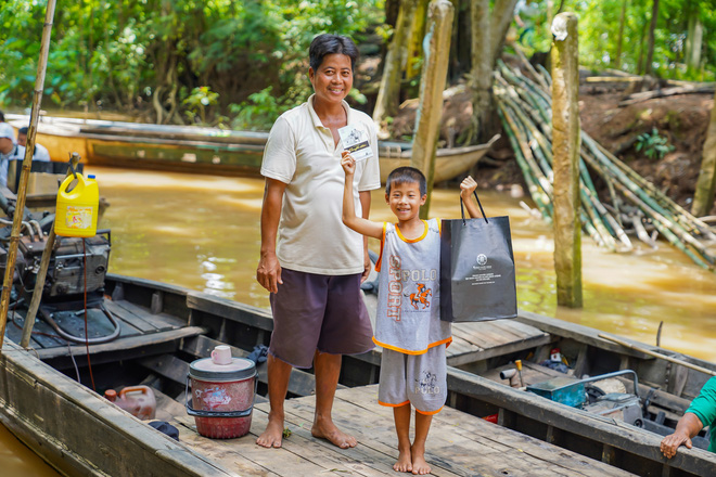 Hai cha con người miền Tây rất hào hứng khi nhận sách Khuyến học từ Hành trình Từ Trái Tim.