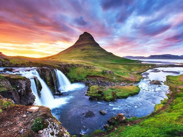 Là ngọn núi được chụp ảnh nhiều nhất ở Iceland, Kirkjufell có vị trí độc đáo trên bán đảo Snæfellsnes. Đỉnh núi trông như nổi lên từ đại dương, và những thác nước giúp làm tăng thêm vẻ hùng vĩ của nó.