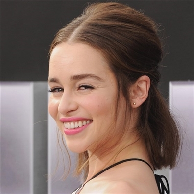 Emilia Clarke trông trẻ trung hơn với mái tóc được buộc lên một nửa. Điểm nhấn của kiểu tóc này là phần được làm phồng phía trước gợi nhắc đến phong cách cổ điển và quý phái của những công nương thời Trung cổ.