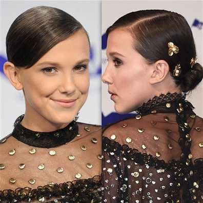 Millie Bobby Brown trở nên sang trọng với mái tóc bóng mượt được búi thấp. Phụ kiện cô chọn để hoàn thiện kiểu tóc của mình là kẹp tóc ánh vàng quý phái.