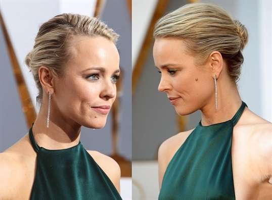 Rachel McAdams chọn kiểu tóc búi cao trung bình và thông minh tạo một đường xoắn nhỏ để làm gọn phần tóc ngắn sau gáy.