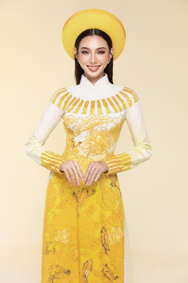 Sinh ra và lớn lên ở miền Bắc, Hoa hậu Lương Thùy Linh diện bộ trang phục tứ thân, tôn lên vóc dáng mảnh mai và những đường nét dịu dàng. Sự kết hợp giữa hai tông màu trắng và vàng cùng điểm nhấn bông hoa nở rộ đã khiến nàng hậu thêm phần duyên dáng.