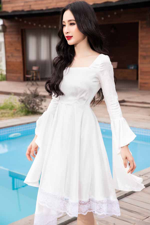 Hoa hậu Trúc Diễm khoe vóc dáng mảnh mai với thiết kế váy khoe vai trần, đi kèm chi tiết xẻ cao đi xem thời trang.
