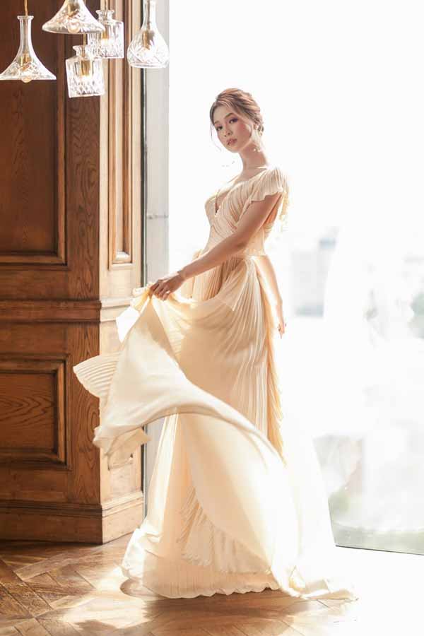 Angela Phương Trinh diện váy sử dụng chất liệu sattin lụa Pháp, tơ tằm Italy, lụa gấm in hoạ tiết ẩn. Đây là thiết kế của Phương Trang, em gái Angela Phương Trinh.