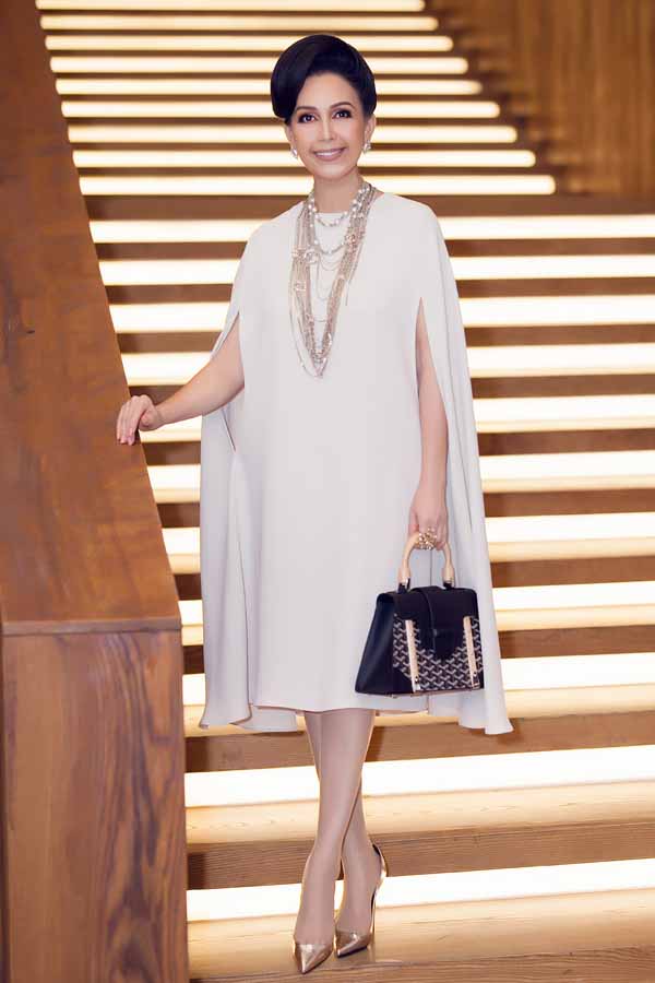 ‘Nữ hoàng ảnh lịch’ Diễm My diện váy màu be của Đỗ Mạnh Cường, kết hợp bông tai, vòng cổ, nhẫn, túi xách, giày hàng hiệu sang trọng khi dự sự kiện cùng chồng giữa tuần qua.