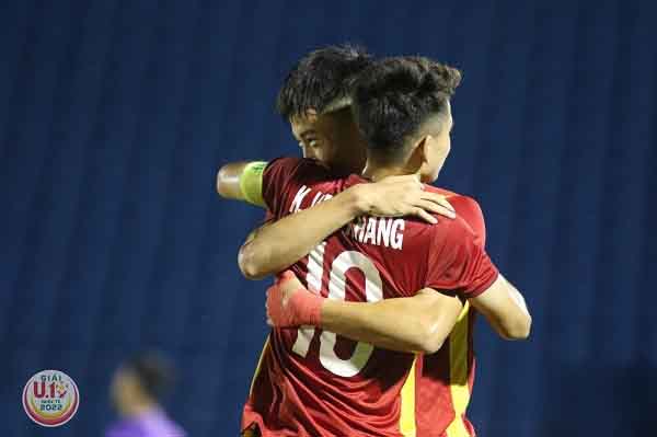 Văn Khang và Văn Trường ăn mừng chiến thắng trước U.19 Myanmar