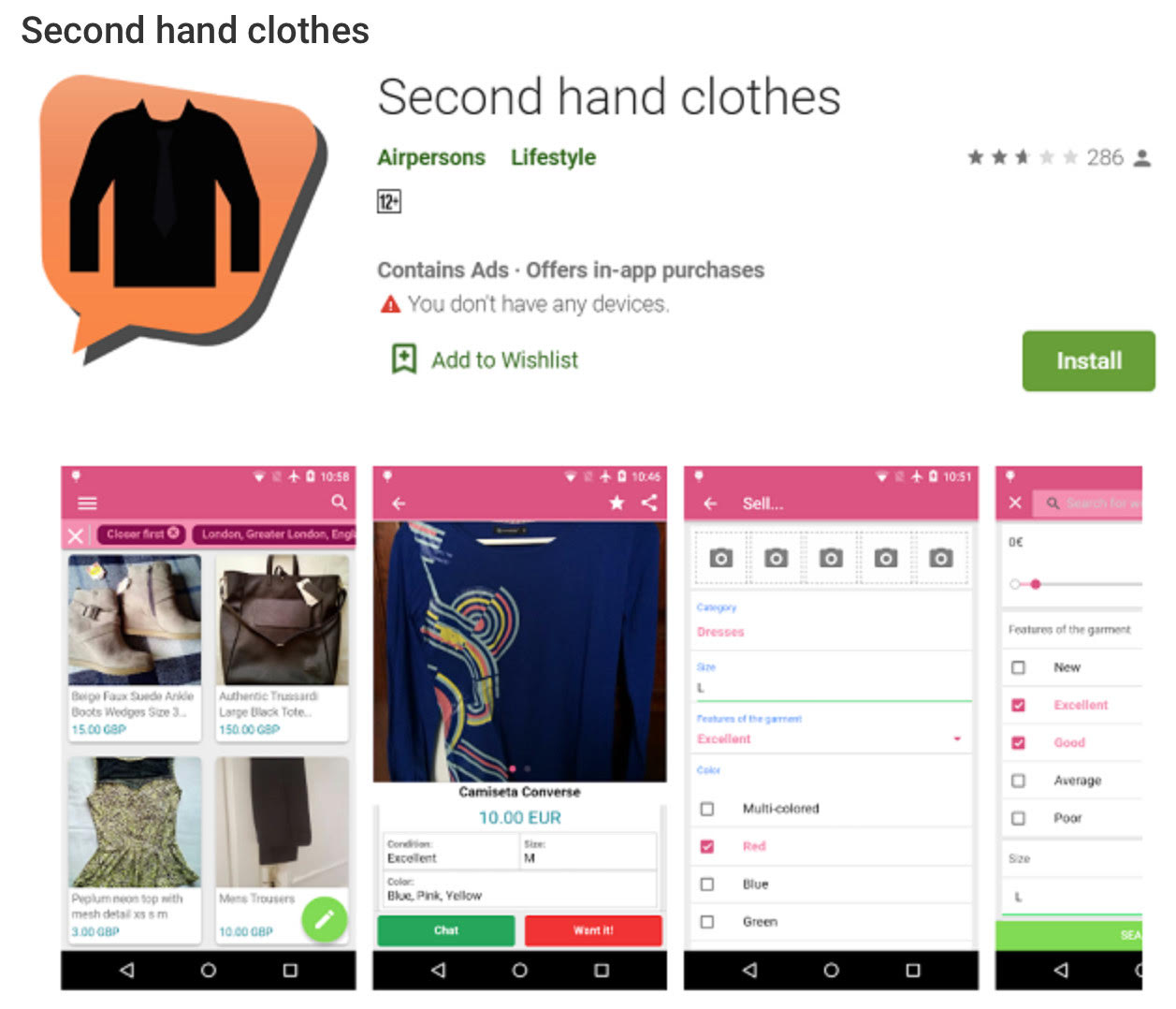 Đây là app chuyên dụng dành cho những người có nhu cầu mua hoặc bán quần áo đã qua sử dụng. Second hand clothes có tính năng phân loại các mặt hàng quần, áo theo giá cả, phong cách, kiểu dáng. Tính này này, giúp khách hàng dễ dàng lựa chọn quần áo phù hợp với nhu cầu của mình trong số hàng ngàn mẫu.