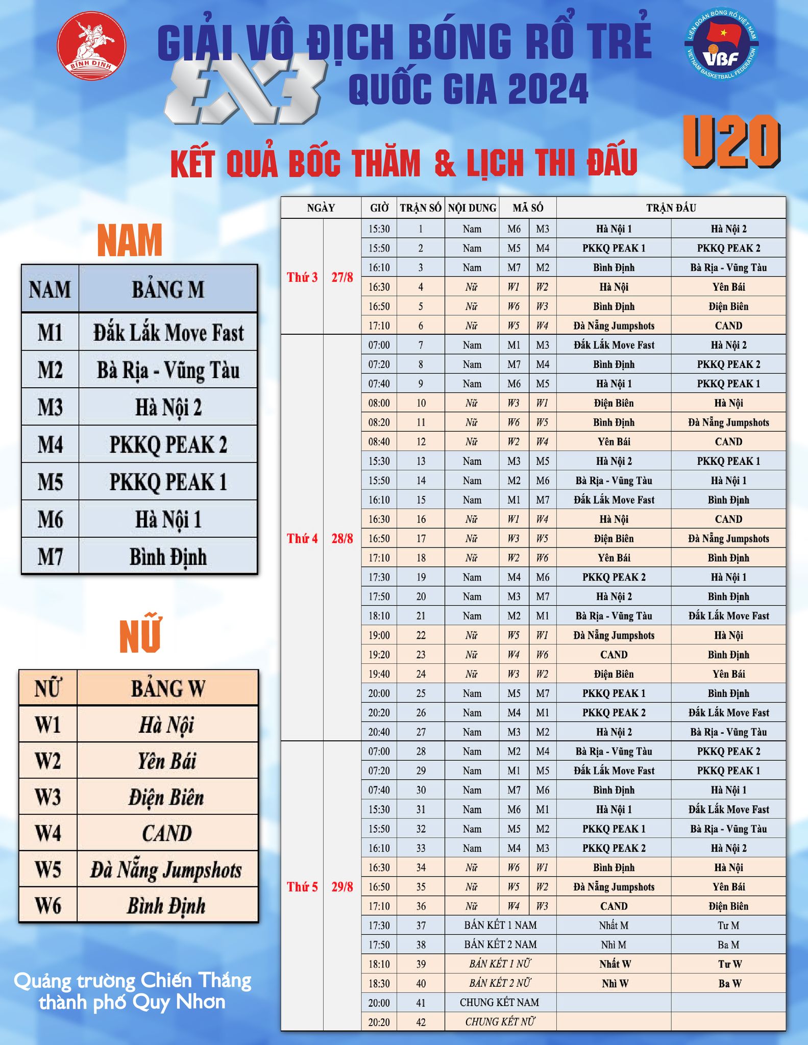 Các vận động viên thi đấu từ ngày 27.8 đến ngày 29.8 tại sân thi đấu Quảng trường Chiến Thắng (khu vực bãi biển Quy Nhơn, phường Lê Lợi, TP. Quy Nhơn). Tất cả các trận đấu sẽ được phát sóng trực tuyến trên kênh Fanpage Liên đoàn Bóng rổ Việt Nam và hệ sinh thái FPT Play.