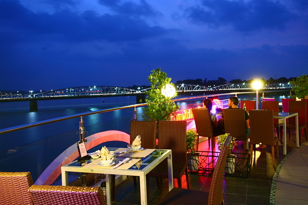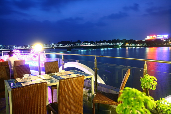Lầu 2 với không gian thoáng đãng, những khoảng mái che nho nhỏ tạo những điểm nhấn thú vị. Ngồi ở đây khách có thể thoả sức ngắm cảnh sông Hương và cầu Trường Tiền.