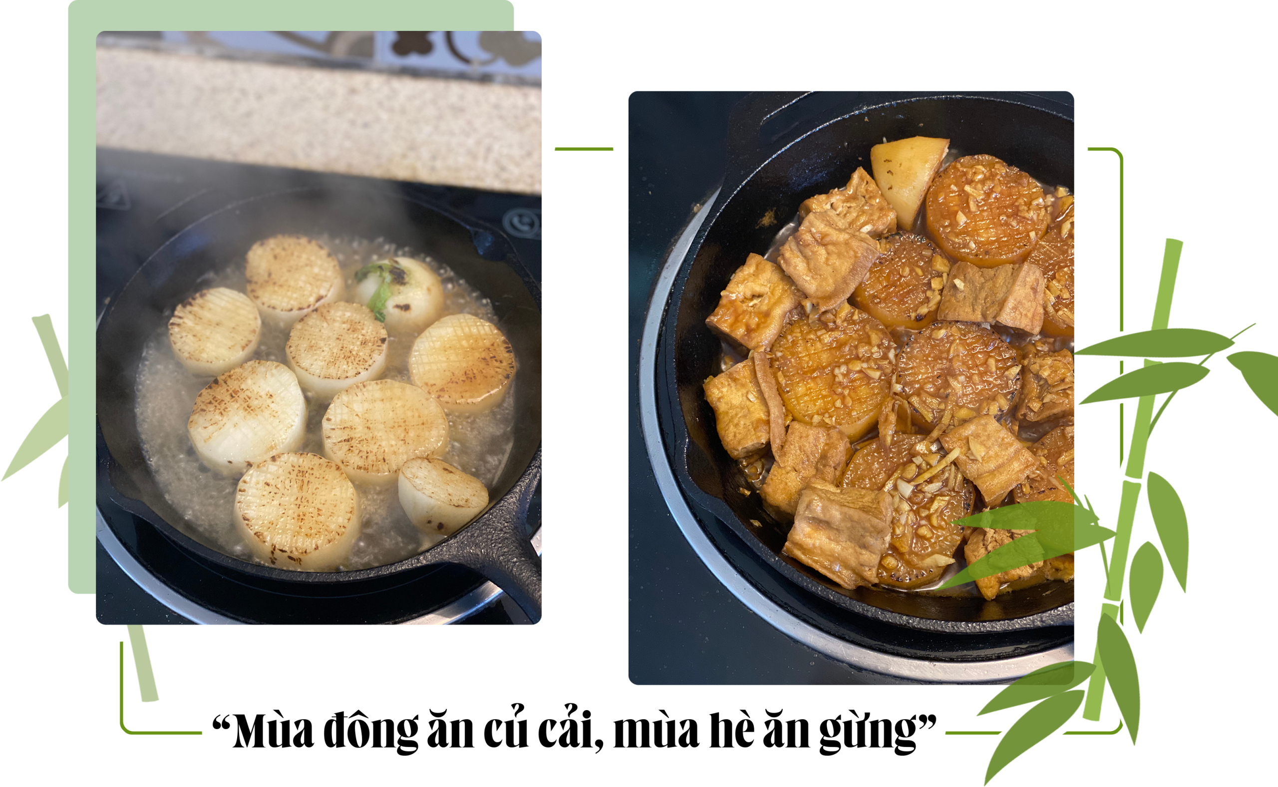 Ông bà có dạy: “Mùa đông ăn củ cải, mùa hè ăn gừng”. Theo như Đông Y, củ cải mang tính hàn, cay, nhưng khi được nấu đúng cách sẽ rất ngọt. Đây là loại củ thân thuộc với người Việt, có tính thải độc với bột bị tẩy trắng hoặc gạo xát trắng, hỗ trợ tiêu hoá, trị ho, và giúp ruột chuyển động mượt mà hơn. Gừng cũng là loại củ được sử dụng nhiều trong nấu ăn để kích thích sự thèm ăn, khử trùng và giải độc, phòng ngừa cảm lạnh mùa hè/mùa mưa (Tuy nhiên ăn gừng quá nhiều hoặc lạm dụng sẽ khiến cơ thể bị lạnh ngược từ bên trong nên cần lưu ý). Tương tamari là loại nước tương lên men thuần không có hoá chất. Miso là đậu tương lên men. Cả hai loại gia vị này đều có thể được tìm thấy dễ dàng ở các cửa hàng thực dưỡng.