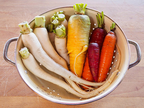 Nước nấu sôi, cho nui vào luộc vừa mềm. Đổ nui ra rổ, xả với nước lạnh rồi để ráo, thêm chút dầu ăn xốc đều để nui không bị dính. Cà rốt, củ cải trắng gọt vỏ, xắt hạt lựu lớn hoặc miếng nhỏ. Hành, ngò rửa sach, cắt nhỏ.