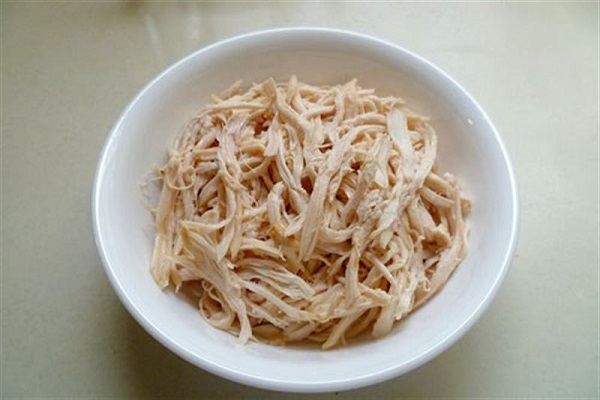Bắc nồi nước dùng lên bếp, cho gà vào luộc để lấy nước dùng ngọt tự nhiên. Gà vừa chín, vớt gà ra, đợi nguội rồi xé nhỏ.