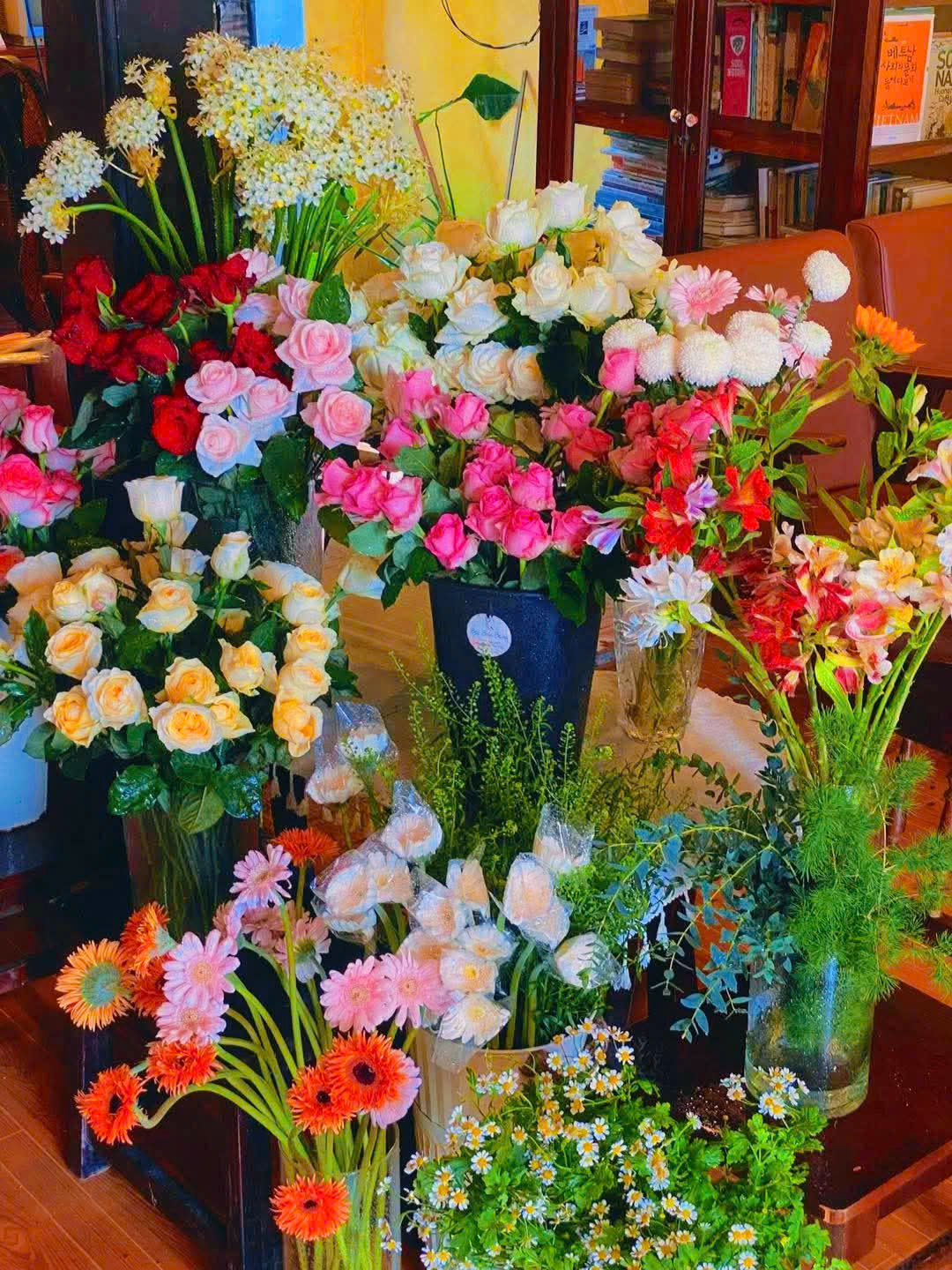 Để thu hút khách hàng, các quán cà phê thường được trang trí lộng lẫy, thoáng đãng, tràn ngập sắc hoa như hoa hồng baby, hoa đồng tiền, hoa cúc họa mi… Đặt bên cạnh đó là các loại giấy gói, sợi ruy băng, nơ, phụ kiện trang trí giúp bó hoa thêm phần trọn vẹn. Và không thể thiếu các dụng cụ cần thiết như kéo, dao cắt tỉa, băng keo giúp khách hàng thực hiện các thao tác trơn tru, dễ dàng hơn.