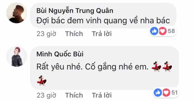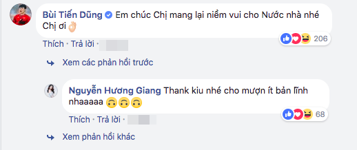 Ngay sau khi nhận được lời chúc đáng yêu của đàn em, Hương Giang lập tức trả lời lại đầy thân thiết và bản thân người đẹp cũng hi vọng mình sẽ có được bản lĩnh mạnh mẽ như các cầu thủ U23 đã từng “chiến đấu”: “Cảm ơn nhé, cho mượn ít bản lĩnh nha”. Phần bình luận qua lại của cả hai khiến người hâm mộ vô cùng thích thú.