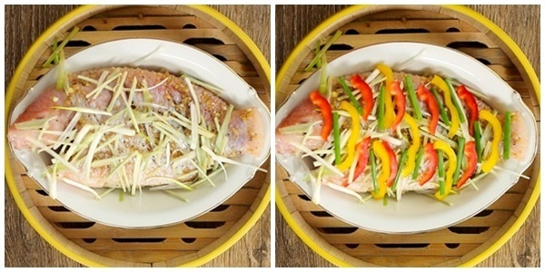 Bước 2: Chuẩn bị xửng hấp, đặt lên xửng 1 chiếc dĩa có lót sẵn1/2 số gừng và đầu hành thái sợi. Đặt cá diêu hồng vào dĩa, rãi 1/2 đầu hành lá và gừng còn lại lên trên. Xếp xen kẽ thêm ớt chuông đỏ vàng và hành lá cho món cá bắt mắt.