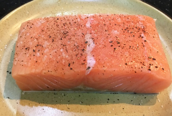 Cá hồi mua về rửa sạch, ướp cùng một chút muối và tiêu xay.