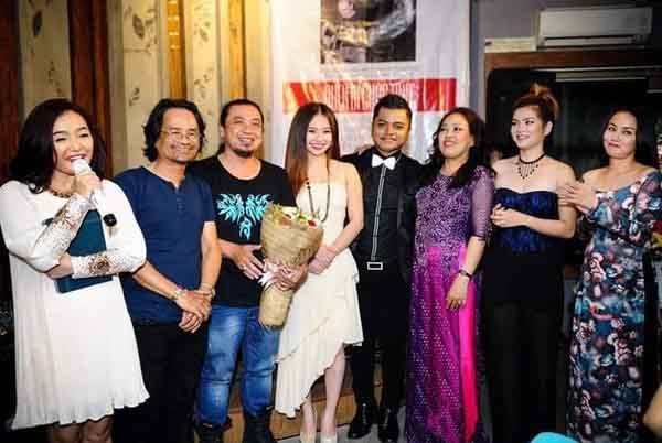 Ca sĩ Y Jang Tuyn (thừ 5, trái sang) cùng với ê-kíp văn nghệ sĩ guitarist Cao Minh Đức, ca sĩ Lan Thảo, Lê Anh, Lina Nguyễn, Quỳnh Như, MC Diễm Quỳnh… trong đêm nhạc “Quên đi cuộc tình” tổ chức tại Sài Gòn, 7.2016. (Ảnh: Nguyên Trương)