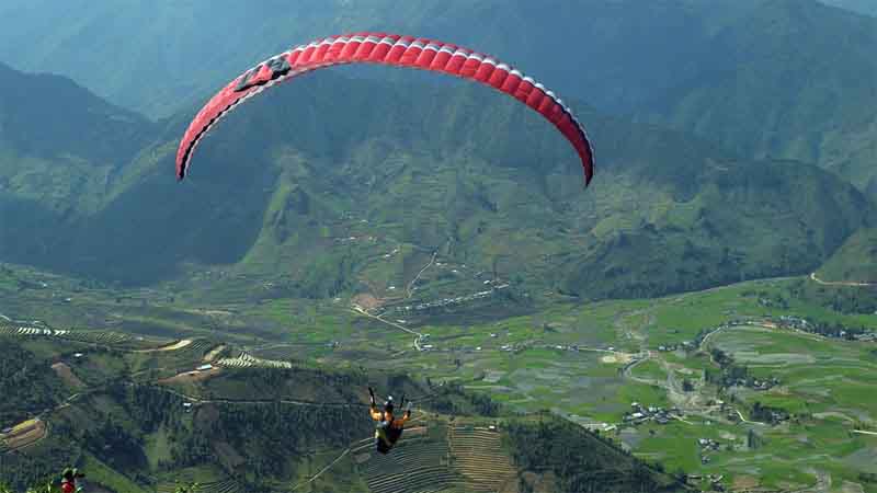 Nhắc đến trải nghiệm dù lượn phải kể tới đầu tiên là khu vực miền núi Phía Bắc với cảnh quan núi rừng ruộng đồng hùng vĩ tuyệt đẹp. Trong đó, nổi tiếng nhất là Mù Cang Chải (Yên Bái) và Hoàng Su Phì (Hà Giang). Đây là những địa điểm cuốn hút những tín đồ bởi màu vàng lúa chín rực rỡ của những thửa ruộng bậc thang, địa hình núi non ngút ngàn với độ cao trên 1000m và điều kiện thời tiết vô cùng mát mẻ. Bay lượn trên bầu trời, bạn sẽ có nhiều tầng cảm xúc hứng khởi, vừa choáng ngợp trước thiên nhiên, mà còn cảm nhận được nét đẹp dân tộc đặc sắc của bản làng vùng cao.