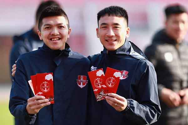 Các cầu thủ Hải Phòng vui vẻ sau khi nhận bao lì xì