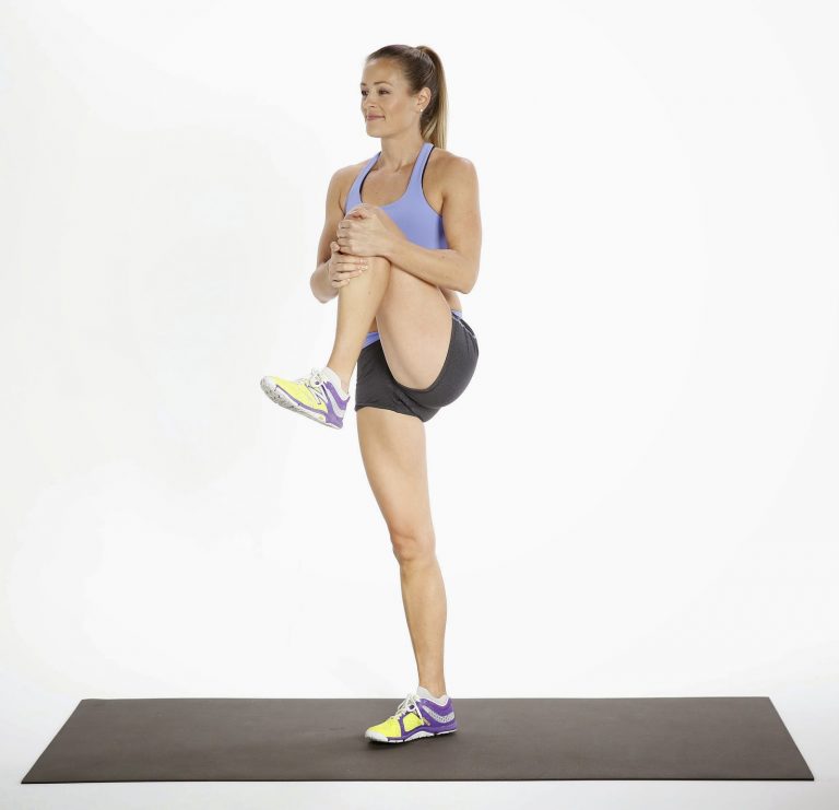 Đứng dậy, đan tay vào nhau, và ôm chặt một đầu gối vào ngực. Cố gắng giữ chân kia thẳng. Giữ vị trí trong ba giây hoặc lâu hơn rồi đổi chân. Động tác này giúp bạn vận động cơ hông đến mức tối đa.