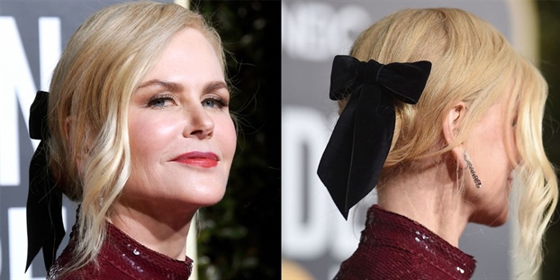 Thoạt nhìn, Kidman chỉ trang điểm đơn giản với mái tóc búi thấp được đánh rối nhưng khi quay lại cô thu hút mọi ánh nhìn bởi một chiếc nơ nhung lớn. Cô chọn phong cách trang điểm đơn giản: son cùng màu trang phục, mắt đánh tông sáng màu.