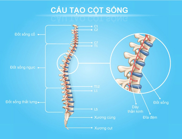 Cột sống chúng ta là một chuỗi gồm 32 –-34 đốt sống chồng lên nhau, được ngăn cách bằng các đĩa đệm và chia thành 5 đoạn: đoạn cổ, đoạn ngực, đoạn thắt lưng, xương cùng và xương cụt.