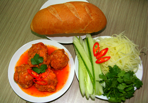 – Xíu mại nấu chín ăn kèm với bánh mì cùng các loại rau đã chuẩn bị sẵn như đu đủ bào, dưa leo thái lát mỏng…