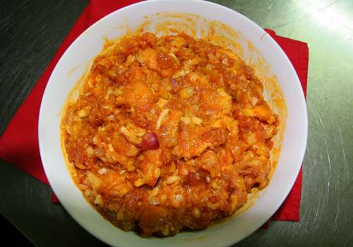 – Làm nóng dầu, cho tỏi vào phi thơm. Tiếp đến cho 1/2 củ hành tây đã thái hạt lựu vào xào chín. Cho tương ớt, tương cà (bạn có thể thay bằng cà chua thái hạt lựu nếu thích) vào đảo đều.