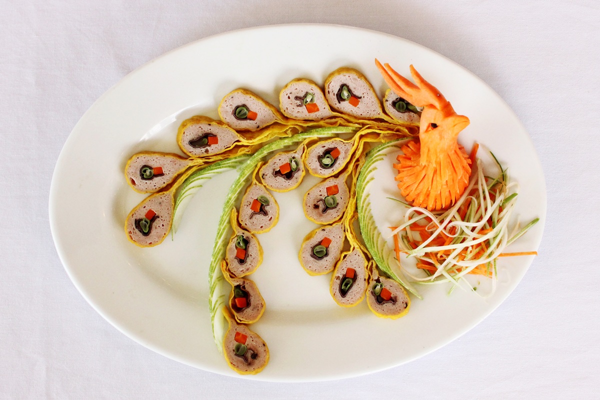 Bước 10: Xếp các miếng chả chạy dọc hai bên thành đĩa như trong hình. Bạn sẽ thấy màu vàng của trứng, màu xanh của đậu, màu cam của cà rốt cùng với màu sáng của giò sống, màu sẫm của rong biển đan xen nhau sẽ tạo ra hình những chiếc lông chim Phượng vô cùng bắt mắt.