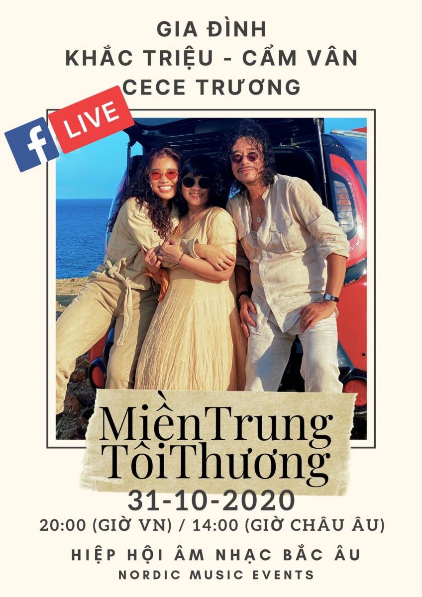 Cặp đôi tài danh ca sĩ Cẩm Vân, tay trống Khắc Triệu và con gái Cece Trương, một giọng ca mới sẽ có một buổi biểu diễn Live stream trực tiếp vào lúc 20 giờ tối nay, 31.10 để hướng về đồng bào miền Trung đang lâm vào cảnh màn trời chiếu đất, tổn thất nặng nề trong đợt hứng chịu nhiều cơn bão liên tiếp vừa qua. DDVN đã có một cuộc trò chuyện với ca sĩ Cẩm Vân về buổi diễn đặc biệt này.   Tin và bài liên quan: Nhớ nhạc sĩ Nguyễn Ánh 9, 'Buồn ơi, chào mi!' Nhạc sĩ Nguyễn Quang, người sống cùng Âm nhạc Việt (Kỳ 1) Nhạc sĩ Huỳnh Hữu Thạnh: Tôi đã đến với cây đàn 'kỳ lạ' như thế nào?