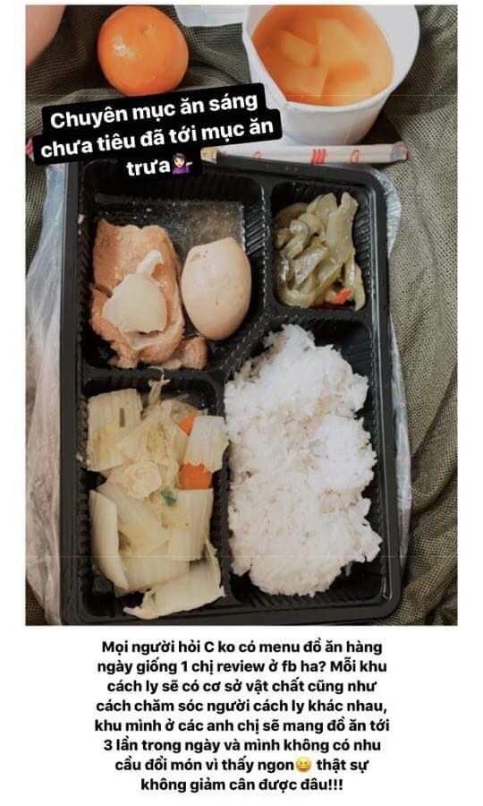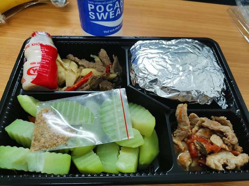 Chắc chắn nhiều người sẽ tò mò một bữa ăn ở các khu vực cách ly tập trung sẽ như thế nào, có đủ dinh dưỡng và ngon hay không, xem qua loạt ảnh của Châu Bùi sẽ hoàn toàn yên tâm bởi nhà nước chăm sóc vô cùng chu đáo. Các bữa ăn luôn phong phú, đa dạng các loại thực phẩm từ thịt lợn, gà, cá, trứng… với nhiều kiểu chế biến khác nhau. Không chỉ có bữa chính mà có cả hoa quả, đồ ăn tráng miệng.