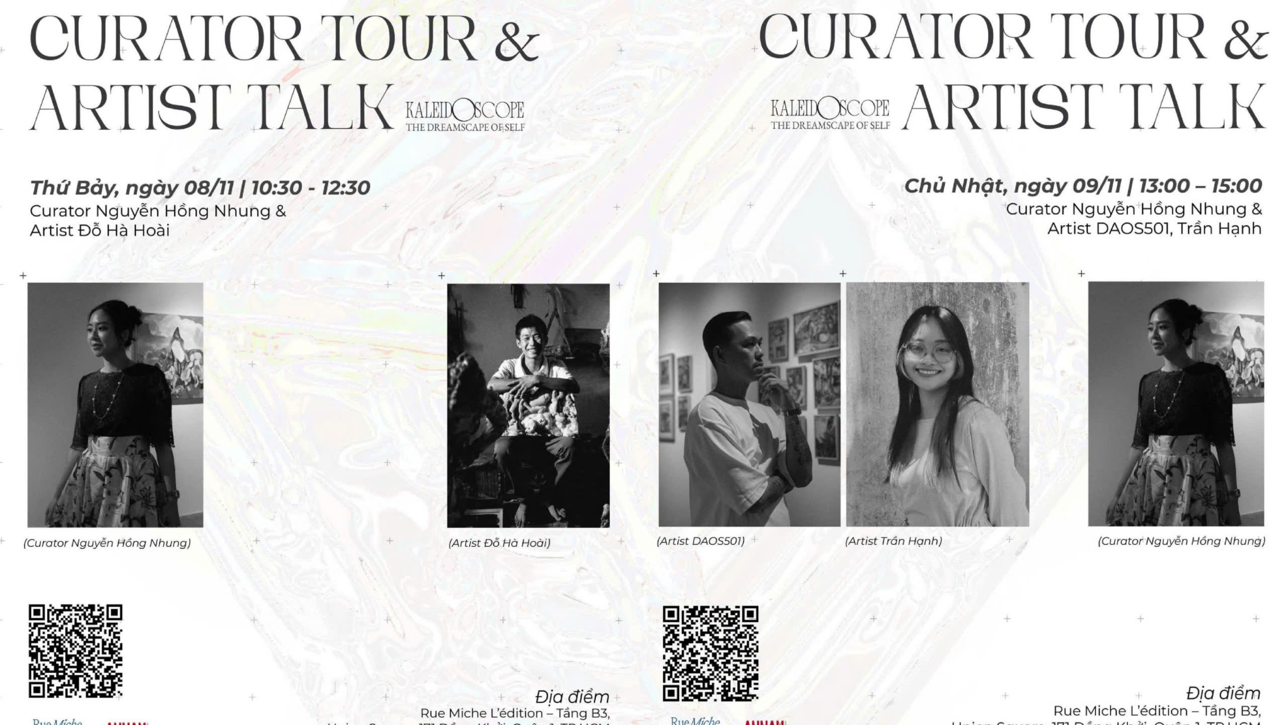 Triển lãm "Kaleidoscope - The Dreamscape of Self" mở cửa tự do, diễn ra từ ngày 21.10 đến hết ngày 23.11.2025, trong khung giờ từ 10 giờ đến 21 giờ hằng ngày, tại Rue Miche L'édition, tầng hầm B3 Trung tâm thương mại Union Square (171 Đồng Khởi, phường Bến Nghé, Quận 1 cũ). Đây hứa hẹn sẽ là điểm đến nghệ thuật đầy cảm hứng, nơi công chúng có thể tự do đắm mình trong không gian sắc màu và cảm xúc của những nghệ sĩ đương đại Việt Nam.
