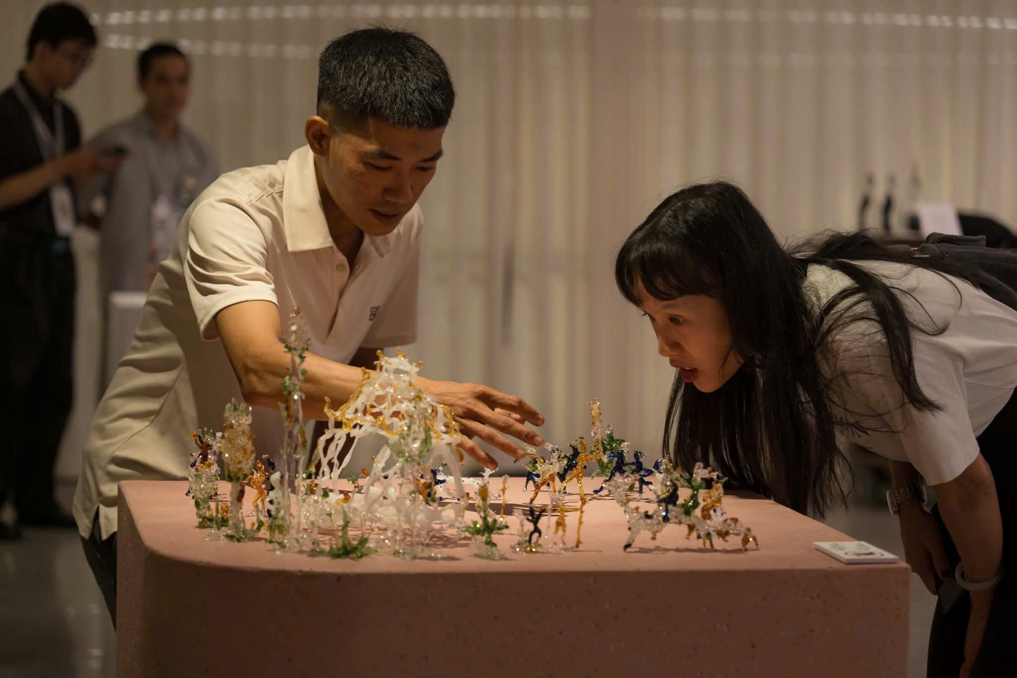 Mỗi tác phẩm tại triển lãm là một vũ trụ riêng biệt, phản chiếu những biến chuyển tinh tế trong tâm hồn con người. Từ những bố cục ngẫu hứng, cường độ màu táo bạo đến lớp men trong suốt gợi ánh sáng nội tâm, người xem như lạc vào một hành trình thị giác đầy mê hoặc và chiêm nghiệm.