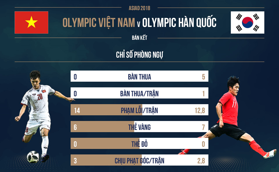 Những con số trước trận đấu chỉ ra Olympic Việt Nam không hề lép vế đối thủ trước trận bán kết ASIAD 2018 diễn ra lúc 16h. Không có quá nhiều khác biệt ở mặt trận tấn công giữa Olympic Việt Nam và Olympic Hàn Quốc. Hai đội có số cú sút mỗi trận và tỷ lệ kiểm soát bóng khá tương đồng. Olympic Việt Nam mỗi trận có nhiều cú sút trúng đích hơn, nhưng lại không ghi nhiều bàn như đối thủ.