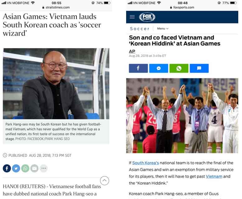 Trước trận chiều nay nhiều báo lớn như Foxsports.com, Straistimes, TheSun…đều có bài viết xoay quanh trận đấu này. Tuy nhiên việc vượt qua Olympic Việt Nam là điều không hề dễ dàng. Bởi theo tờ Foxsports: Son Heung Min cùng đồng đội phải đối mặt với Việt Nam và một “Hiddink Hàn Quốc” tại Asian Games.