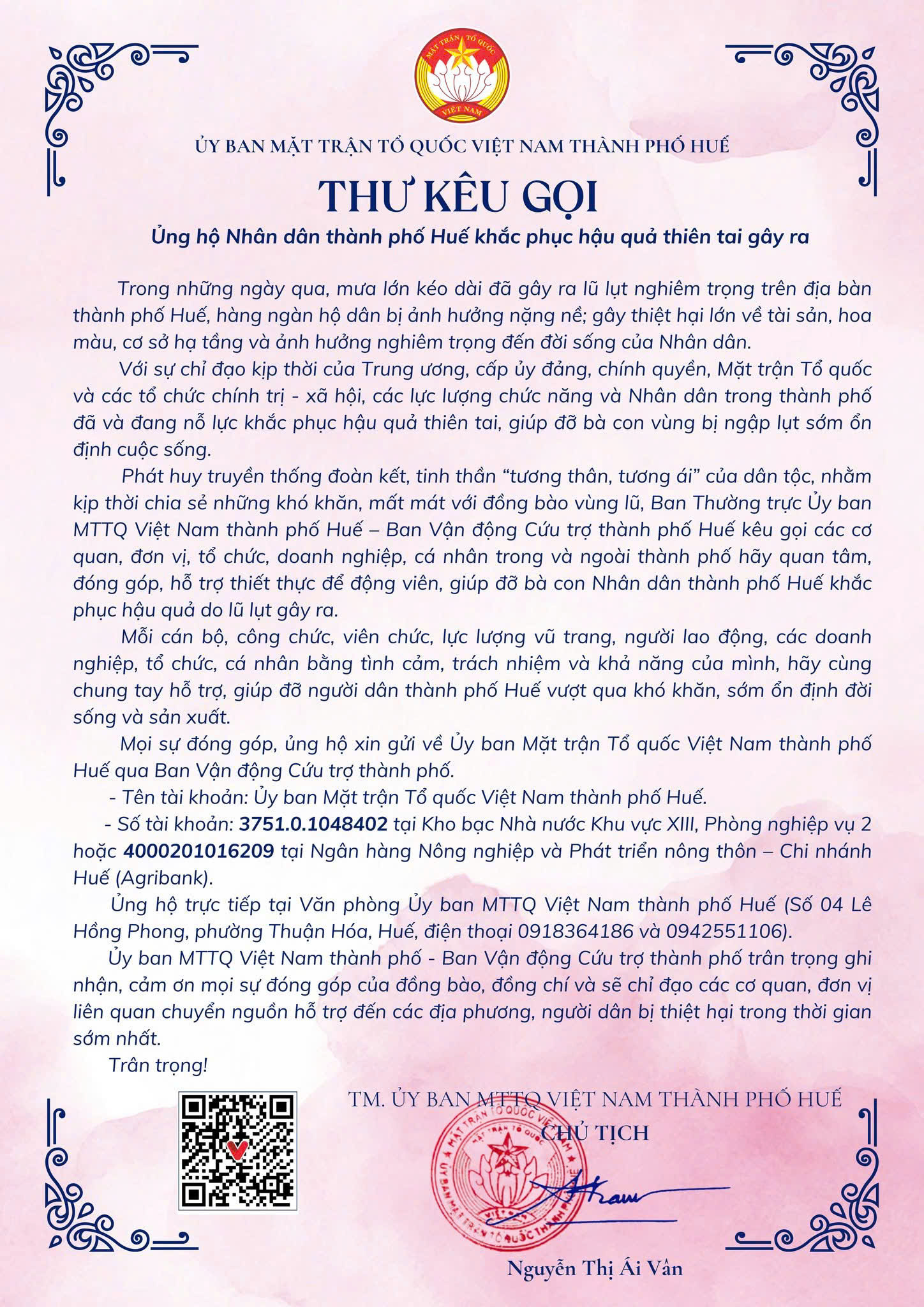 Thư kêu gọi của Ban Thường trực Uỷ Ban Mặt Trận Tổ Quốc Việt Nam thành phố Huế ủng hộ Nhân dân Thành phố Huế để khắc phục hậu quả thiên tai - Ảnh: Thông tin Chính phủ