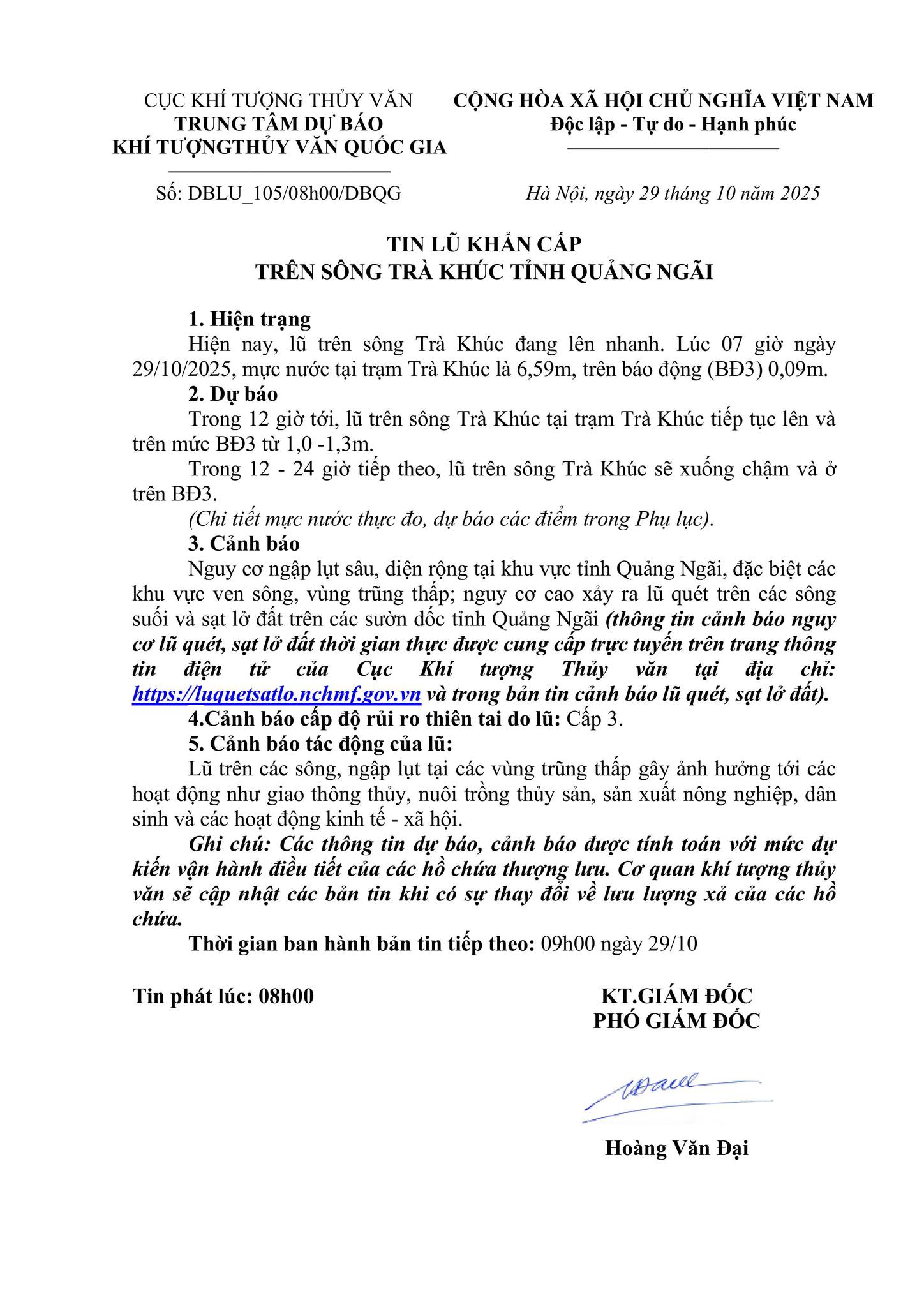 Báo cáo của Cục Khí tượng Thủy văn cho biết lúc 7 giờ ngày 29.10, mực nước tại trạm Trà Khúc là 6,59m, trên báo động (BĐ3) 0,09m. Dự báo trong 12h tới (kể từ khi văn bản ban hành lúc 8h sáng cùng ngày), lũ trên sông Trà Khúc tại trạm Trà Khúc tiếp tục lên và trên mức BĐ3 từ 1,0 -1,3m. Trong 12 - 24 giờ tiếp theo, lũ trên sông Trà Khúc sẽ xuống chậm và ở trên BĐ3.