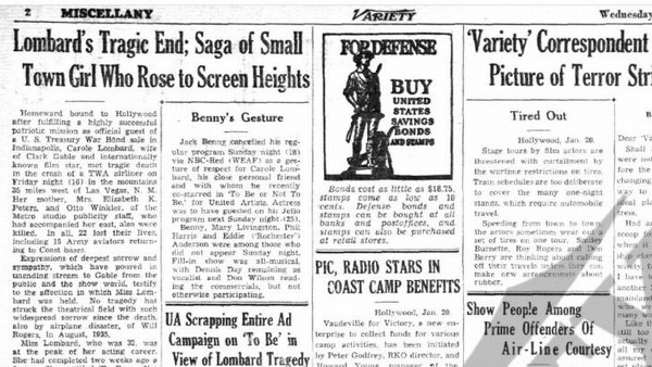 Tờ Variety đưa tin về cái chết của Carole Lombard