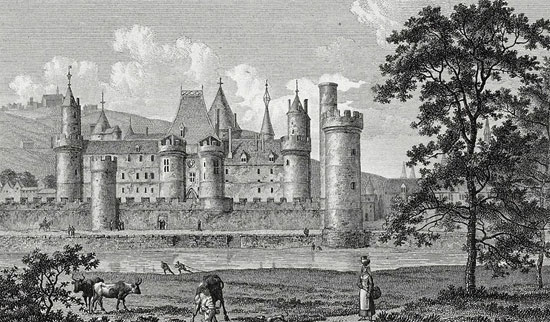Tranh khắc của Louis Pierre Baltard (vào (thế kỷ 18) miêu tả lâu đài Louvre và sông Seine vào khoảng những năm 1200