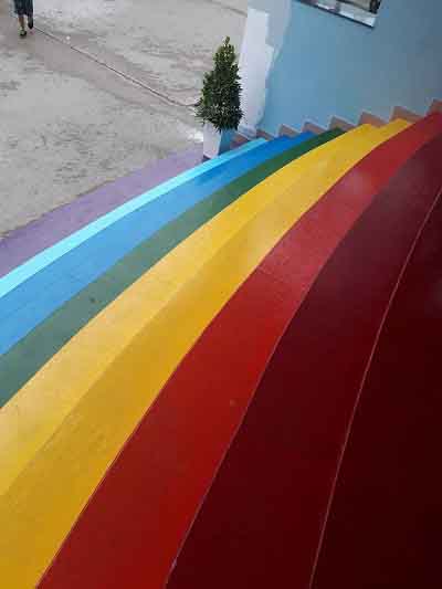 Ngoài ra trường còn có một cầu tháng đủ màu sắc rất thích hợp để học sinh chụp ảnh check-in.