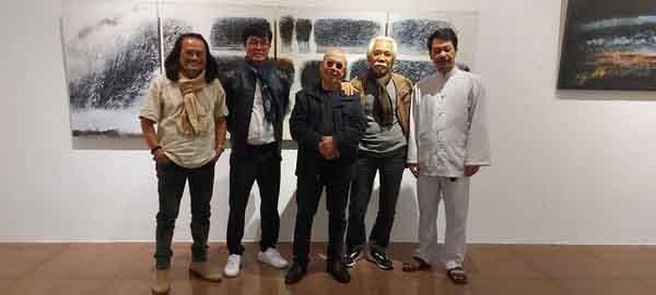 Gặp gỡ tại triển lãm “Mùa nước nổi” Hà Nội, 12.12.2021. Từ trái sang: Nhà thơ Chu Giang Phong, họa sĩ Ca Lê Thắng. họa sĩ Thành Chương, họa sĩ Đinh Phong, nhà thơ nhạc sĩ Nguyễn Hữu Hồng Minh. (Ảnh: Trần Hùng).