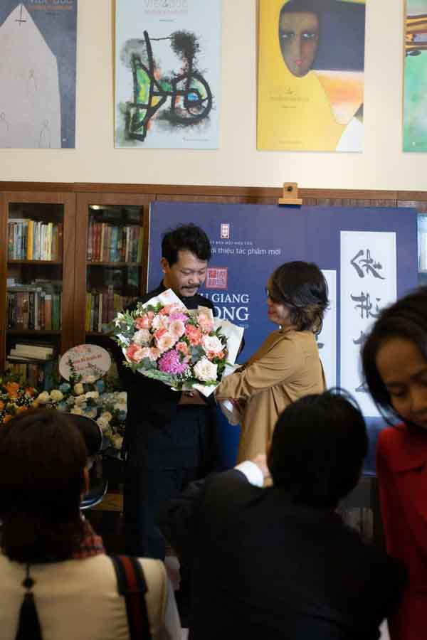 Cô Nguyễn Thúy Hằng, Phó giám đốc nxb Hội Nhà Văn tặng hoa chúc mừng tác giả Chu Giang Phong trong buổi ra mắt, giới thiệu bộ sách cùng độc giả.
