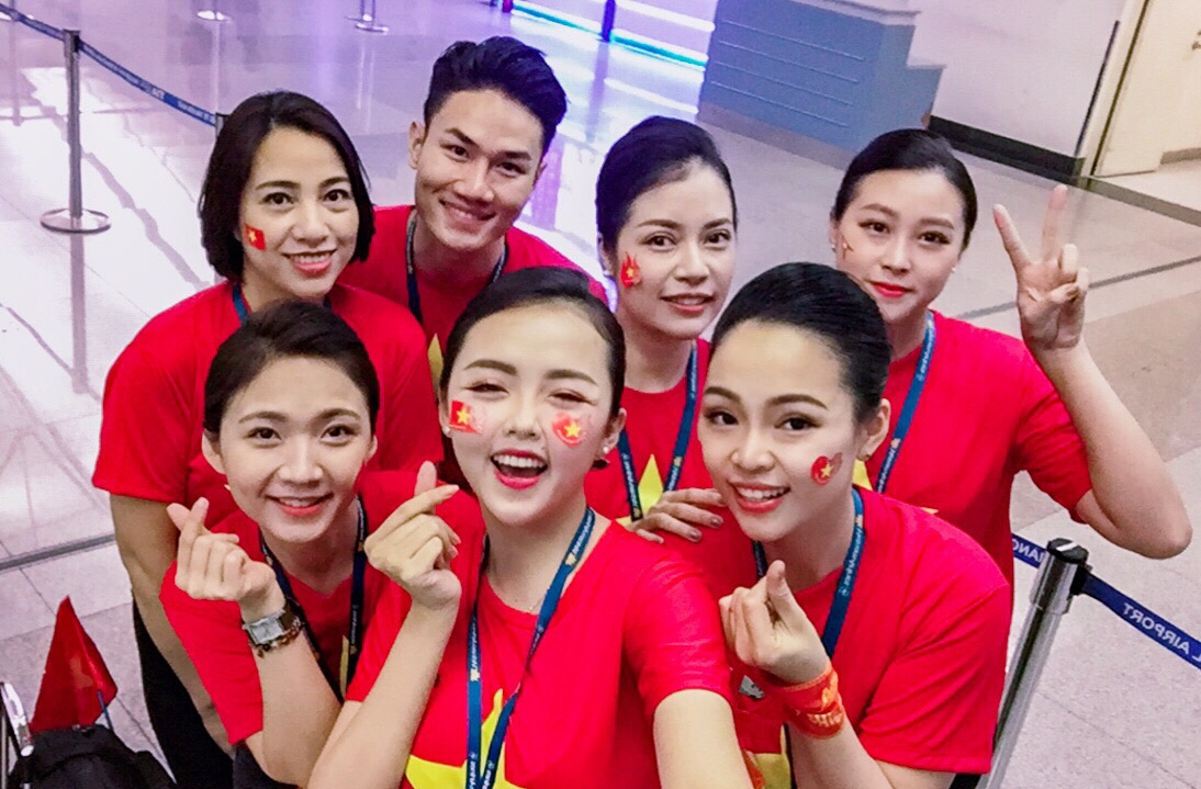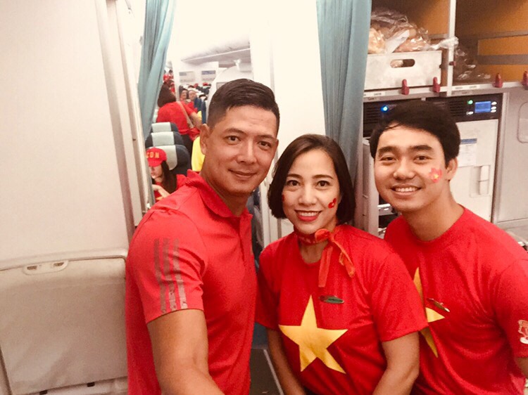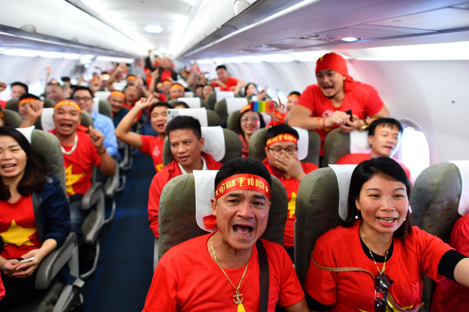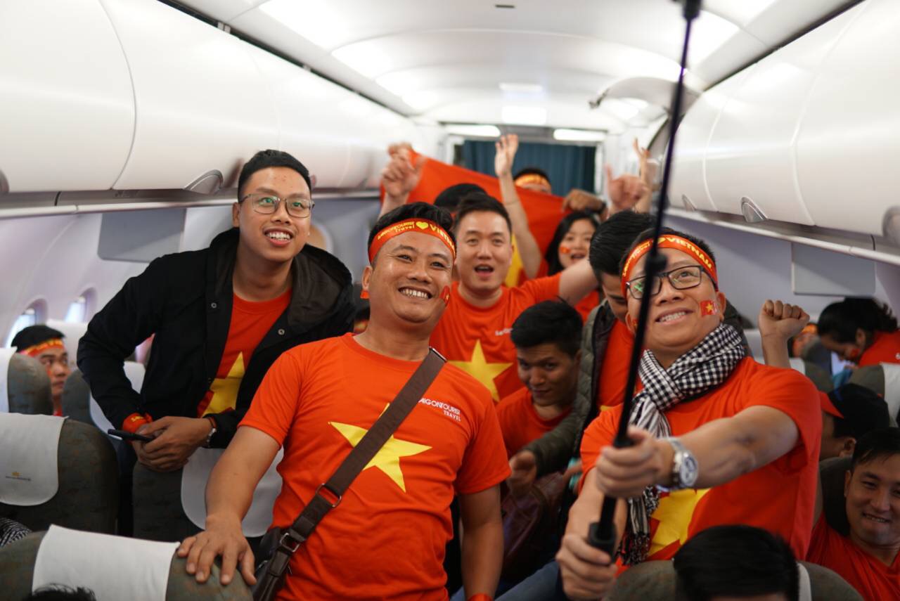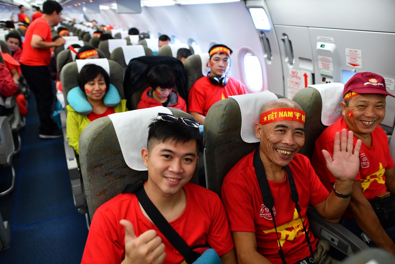 Một số hình ảnh cổ động viên Việt Nam trên các chuyến bay của Vietnam Airlines bay sang Kuala Lumpur sáng ngày 11/12: