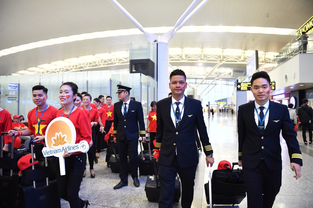 Ông Dương Trí Thành – Tổng Giám đốc Vietnam Airlines lên sân bay Nội Bài tiễn và tiếp lửa cùng cổ động viên bay sang Malaysia cổ vũ đội tuyển Việt Nam tại trận Chung kết lượt đi AFF Cup 2018