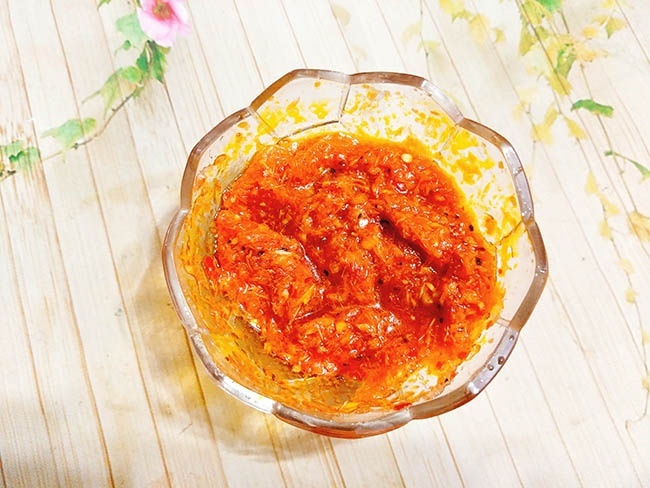 – Đổ hỗn hợp sả vừa xay ra bát rồi thêm nước mắm, hạt nêm, tiêu, đường, nước cốt chanh, dầu điều rồi khuấy thật đều nguyên liệu cho đường tan hết.