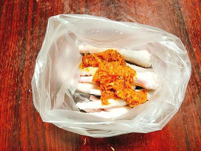 – Cho chân gà vào túi nilon sạch sau đó đổ hỗn hợp gia vị vừa chuẩn bị vào cùng, xóc thật đều và ướp chân gà 1-2 tiếng cho ngấm gia vị.