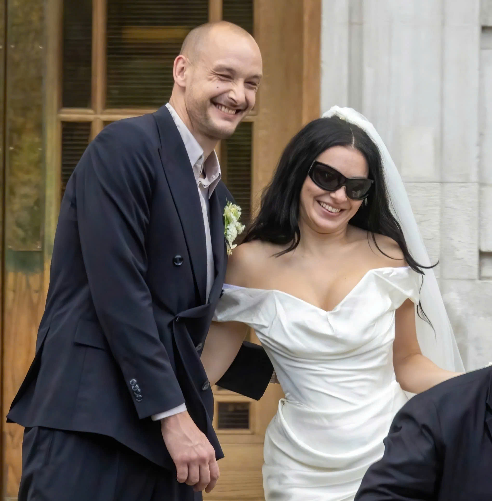 Những khoảnh khắc tại lễ cưới nhanh chóng được lan truyền trên mạng xã hội, ghi lại hình ảnh Charli XCX trong chiếc váy midi lụa trắng trễ vai thanh lịch, kết hợp cùng khăn voan ngắn và cặp kính râm đen cá tính – một dấu ấn thời trang quen thuộc của nữ ca sĩ. Bên cạnh cô, chú rể George Daniel xuất hiện lịch lãm trong bộ suit đen cổ điển. Cả hai rạng rỡ trao nhau nụ hôn ngọt ngào trước bậc thềm tòa thị chính, đánh dấu khoảnh khắc chính thức bước vào cuộc sống hôn nhân.