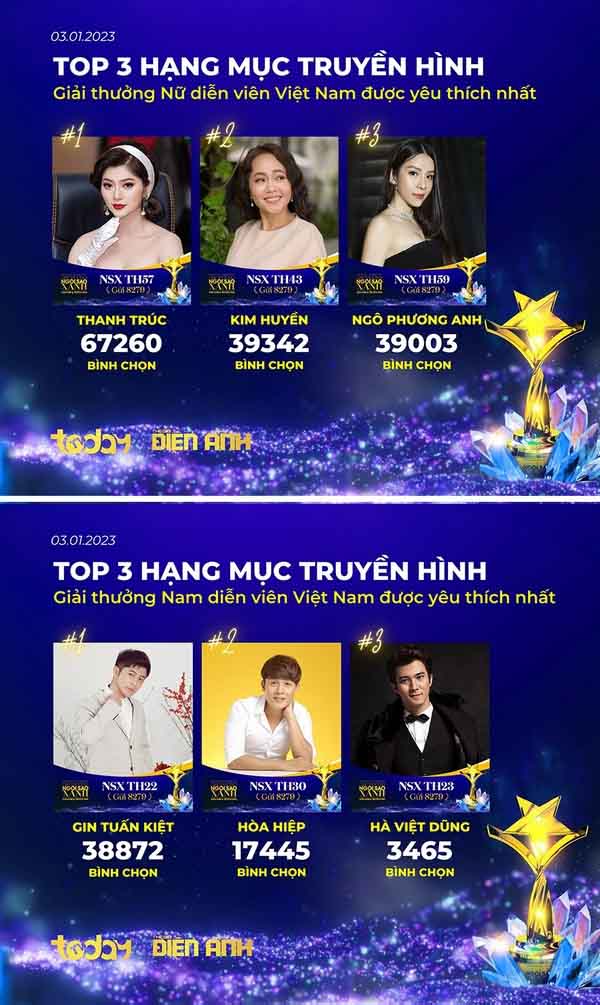 Với sự góp mặt của hơn 150 đề cử, đường đua hạng mục “Truyền hình” trở nên đầy gay cấn, hồi hộp đến từng giờ. Nổi bật hơn hết là diễn viên Thanh Trúc với 67.260 vote, tạm dẫn đầu giải “Nữ diễn viên được yêu thích nhất”. Ở giải “Nam diễn viên được yêu thích nhất”, Gin Tuấn Kiệt là cái tên giữ vững top 1 xuyên suốt thời gian bình chọn với 38.872 vote.