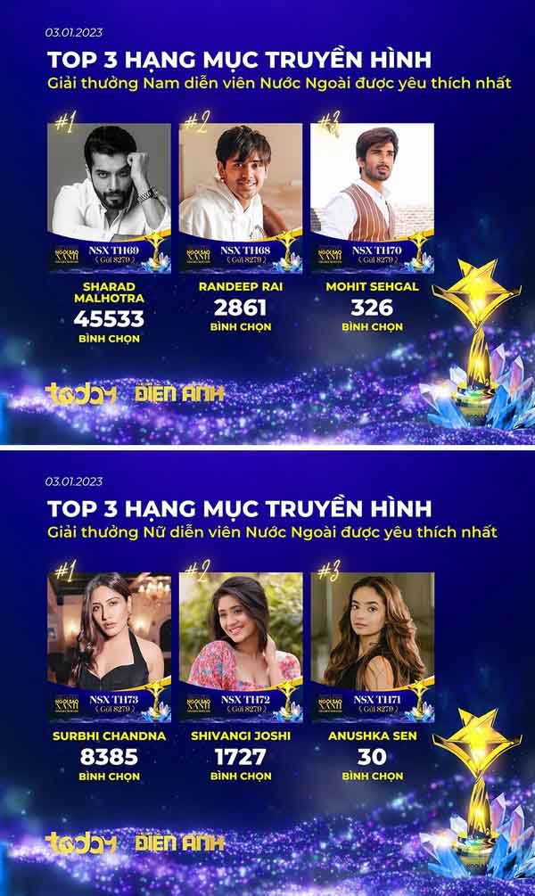 Ngoài đề cử Việt, “Ngôi Sao Xanh” còn dành sự vinh danh cho các nghệ sĩ, bộ phim nước ngoài nổi bật, được khán giả yêu thích. Nam/ Nữ diễn viên Ấn Độ Sharad Malhotra và Surbhi Chandna đang dẫn trước ở giải “Nam/ Nữ diễn viên nước ngoài được yêu thích nhất”.