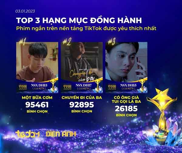 Giải thưởng dành riêng phim ngắn TikTok ở hạng mục “Đồng hành” cũng khiến nhà làm phim trẻ hào hứng. Tính đến ngày khép cổng bình chọn, phim ngắn “Một bữa cơm” (95.461 vote) đang vươn lên dẫn đầu cúp “Phim ngắn trên nền tảng TikTok được yêu thích nhất”, bám sát theo sau là “Chuyến đi của ba” (92.895 vote) và “Có ông già tui gọi là ba” (26.185 vote).